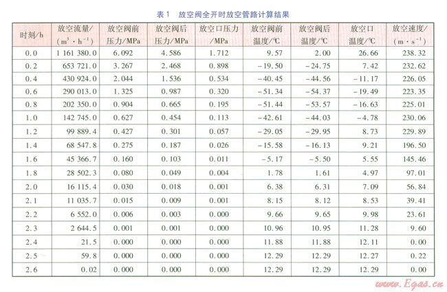 根據式(2),放空瞬間,由于干線管道內壓力與環境壓力(即大氣壓力)的差值大,放窄初期放空流量大,管道內天然氣瞬間膨脹成高速氣流,天然氣的焓轉化成動能,天然氣溫度急劇降低,可以達到