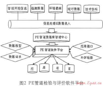 軟件平臺(tái)是IT技術(shù)在PE管道檢驗(yàn)與評(píng)價(jià)中的應(yīng)用?;跀?shù)據(jù)庫技術(shù)構(gòu)建PE管道信息數(shù)據(jù)庫,有效管理PE管道數(shù)據(jù),從而實(shí)現(xiàn)管道信息共享,并利用信息數(shù)據(jù)庫編制PE管道風(fēng)險(xiǎn)評(píng)估系統(tǒng),構(gòu)建以風(fēng)險(xiǎn)檢驗(yàn)為核心的PE燃?xì)夤艿腊踩u(píng)價(jià)軟件應(yīng)用平臺(tái)。PE管道檢驗(yàn)與評(píng)價(jià)軟件平臺(tái)如圖2所示。