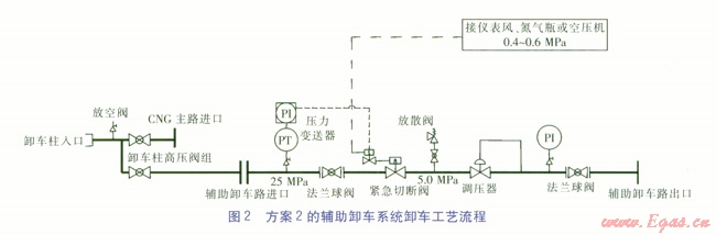 ②從安全角度對3種輔助卸車方案進行比較,認為第2種方案更具優勢。在不影響供氣量的前提下,不僅使CNG氣瓶車的余氣量更少,還大大縮短了卸車時間,提高了CNG氣瓶車的運輸能力,大大降低了綜合運營成本。