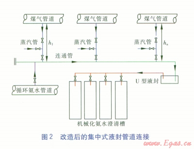 層為焦油,下層為焦油渣,沉淀在槽底的焦油渣由刮板輸送機排出槽外,焦油則通過液面調節器流至焦油槽,澄清后的氨水經上部溢流至循環氨水槽,送往后續工段使用。改造后的集中式液封管道連接見圖2。
