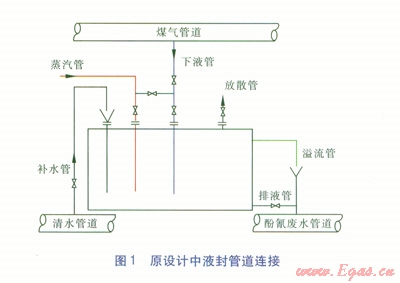 按原設計,煤氣輸送主管道上的附屬液封一期有6個(其余液封為設備專用液封)、二期有8個(其余液封為設備專用液封);每個液封都設有放散管、下液管、溢流管、排液管及蒸汽管等附屬管道,所有下液最后經溢流管流至酚氰廢水管道匯合至污水處理站。原設計中液封管道連接見圖l。