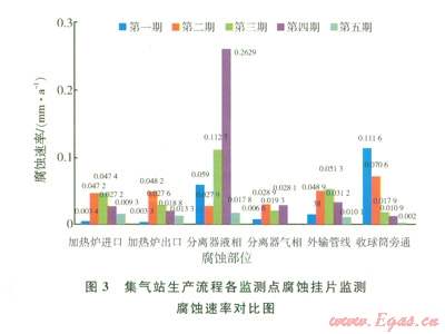 普光氣田從2009年10月投產至今,掛片數據顯示集輸和凈化系統腐蝕處于較低水平,整體受控(圖3),集輸站場內管線和集輸管道平均腐蝕速率基本控制在0.076 mm/a以內。其中集輸系統腐蝕較為嚴重的部位集中在:集氣站場計量分離器氣相和液相部位、收球筒旁通、計量匯管(生產匯管)集輸管道低洼處等存在積液和沉積物的位置。