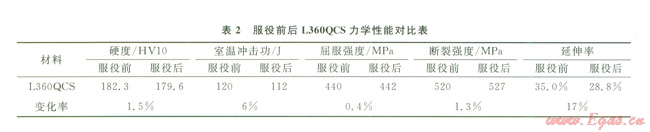 從服役前后管材的力學性能對比來看(表2),管材韌性略有下降、強度略有上升,延伸率相對變化較明顯,但下降不顯著,說明管材的力學性能保持良好。從沖擊試樣和拉伸試樣的斷口來看,均出現明顯韌窩,沒有脆性斷裂的特征。結合固溶氫含量的測量結果,可以判斷,盡管高含硫工況導致管材內固溶部分氫,但遠未達到損傷管體強韌性的程度,管材可以安全服役。