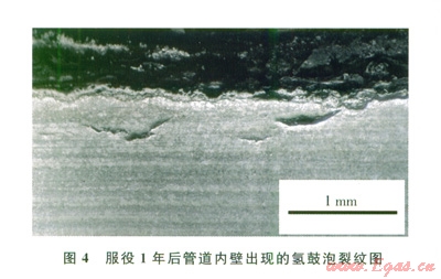 取樣結果顯示,管材內表面無SSC裂紋,僅有少量氫鼓泡,管壁內部無氫致開裂裂紋(圖4),也就是說在高含硫工況下環境開裂問題不嚴重,管材服役性能良好。
