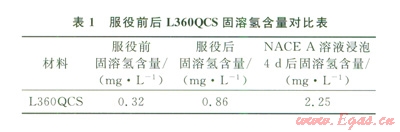 集氣站內管道運行l年后,截取站內管道進行力學性能測試,確定其性能變化情況。將運行后的管材進行NACE的標準HIC和SSC試驗,均未出現開裂。對比測量服役前后以及NACE A溶液浸泡后材料內固溶氫含量發現(表1),服役后管材固溶氫含量雖有所增加,但遠小于在NACE A溶液腐蝕4 d以后管材內的固溶氫含量。說明即使在高含硫工況條件下,氫滲透也遠未達到飽和,管材氫損傷情況不嚴重。