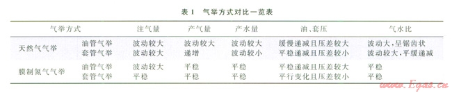 氣舉氣源主要有膜制氮氣和天然氣[7]。鄰井有高壓氣的井選天然氣氣舉,鄰井沒有高壓氣的井選擇膜制氮氣氣舉。膜制氮氣氣舉比天然氣氣舉在注氣量、產氣量、產水量等方面更平穩(表1)。