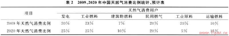 中國天然氣下游市場用戶主要集中在發(fā)電、民用、工業(yè)燃料、建筑物燃料、交通運(yùn)輸燃料、工業(yè)原料等6大領(lǐng)域。2009、2020年中國天然氣消費(fèi)比例統(tǒng)計(jì)、預(yù)計(jì)情況如表2所示[5]。