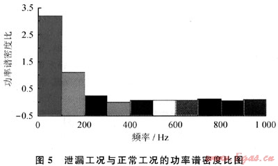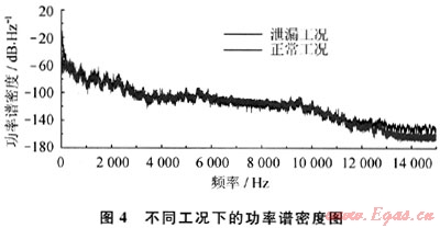 從圖4可以看出,泄漏工況的功率譜和正常工況的功率譜在很長的頻率段上是基本重合的,只是在起點附近兩者有所不同。隨著頻率的增大,不論是泄漏工況還是正常工況,其功率譜密度都逐漸減小,最終逐漸趨于穩定,即高頻部分基本為白噪聲部分。
