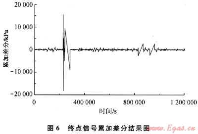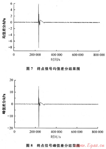從上面對音波信號的時域和頻域分析中可以看出,信號的幅值和功率譜密度是可以作為泄漏判斷的特征量的,這驗證了1.1節的分析結果。除此之外,1.1節提出的相鄰區間信號累加差分、均值差分、峰值差分的特征識別方法,也可以作為泄漏檢測的判斷依據。當管道起點壓力為4.6MPa左右,泄漏孔徑為0.45mm時,將泄漏點1發生泄漏時采集到的測試管段終點的聲壓進行去噪,根據提出的相鄰區間信號累加差分、均值差分、峰值差分的算法,可分別得到終點信號累加差分結果如圖6所示,終點信號均值差分結果如圖7所示,終點信號峰值差分結果如圖8所示。