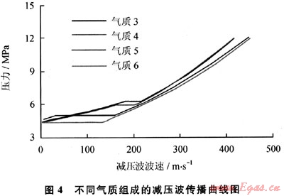 圖3為氣質3~6的相包絡曲線圖,由表2和圖3可知,從氣質3到氣質6,氣質組成逐漸變“輕”,其相包絡曲線的氣液兩相區域逐漸變小。圖4為不同氣質組成的減壓波傳播曲線,初始壓力為12MPa,溫度為30℃。由圖4可知,各曲線出現“平臺”的壓力逐漸降低,“平臺”位置下降。由此可以推測,若氣質組成中重組分含量減少至某程度時,減壓波曲線中的平臺將消失,變為一條光滑的曲線。也就是說,隨著重組分含量的增加,減壓波曲線容易進入兩相區,壓力保持在高位不能迅速下降,增大了管道裂紋擴展的風險。