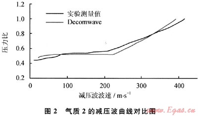 圖1為氣質1減壓波波速計算結果與文獻實驗數據的對比圖,初始壓力為10.58MPa,溫度為-25.59℃。圖中“實驗測量值”指本文參考文獻[6]中通過實驗測得的數據,“Decomwave”為開發軟件計算的減壓波波速結果。