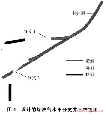 3) 分支類型3:增斜+穩(wěn)斜。軌跡設(shè)計和控制最簡單,一般在煤層中的延伸距離最短。