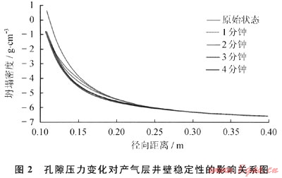 從圖2可以看出,高壓產(chǎn)氣層孔隙壓力的變化對地層井壁穩(wěn)定性的影響十分明顯。從圖2可以看出,與原始地層相比較(即地層不產(chǎn)氣,地層孔隙壓力分布保持原始狀態(tài)),高壓氣層產(chǎn)氣后,近井壁地帶孔隙壓力降低,作用在巖石骨架上的有效應(yīng)力增加,但井壁穩(wěn)定性變好。因此,高壓氣層產(chǎn)氣引起地層孔隙壓力降低有利于產(chǎn)氣層的井壁穩(wěn)定。