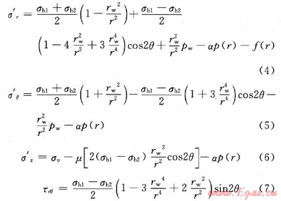 式中σ′r、σ′θ、σ′z和τrθ分別表示徑向、周向、垂向的有效應(yīng)力和剪切力,MPa;σw表示上覆地層壓力,MPa;σh1、σh2分別表示兩個水平方向主地應(yīng)力,MPa;α表示有效應(yīng)力系數(shù),無量綱;μ表示巖右靜態(tài)泊松比;θ表示圓周角,(°);p(r)表示距井壁表面處孔隙壓力,MPa;f(r)表示距井壁表面處拖曳力,MPa。