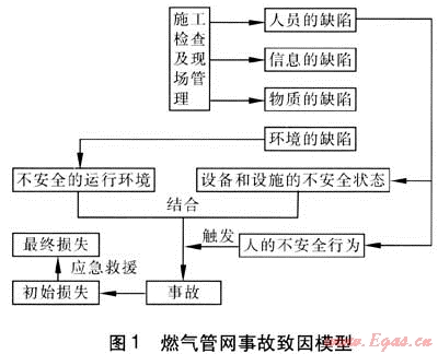 筆者認為:燃氣事故的發生是一些事件鏈的組合,由燃氣管網施工、運行過程中存在的管理失誤,產生人員、物質、環境和信息的缺陷,而這些缺陷又引起了職工的不安全行為、設備和設施的不安全狀態以及不安全的生產環境,最終導致了燃氣事故的發生。