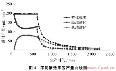 2) 開采初期,以高滲透區供氣為主,高滲透區產量遠大于低滲透區產量;開采后期即穩產期結束后,高滲透區產量遞減很快,而低滲透區產量遞減比較緩慢,且低滲透區產量貢獻率逐漸增大,即生產后期小產量生產時以低滲透區供氣為主(圖4)。低滲透區滲透率越高,則產量貢獻率越大。