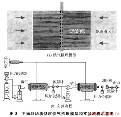 我國油氣儲層以陸相碎屑巖為主,具有砂體規模小,平面上連通性差,非均質性強的特點。因此,在氣田開發中通常將儲層劃分為好(Ⅰ類)、中(Ⅱ類)、差(Ⅲ類)和非有效(Ⅳ類)四類,其中Ⅰ、Ⅱ類為較好的產層,Ⅲ類為低產層,Ⅳ類為難動用儲層。但實際生產和研究表明,低滲透儲層中隨著生產壓差的增大和流動狀況的改善,部分低效層(Ⅲ、Ⅳ類層)將逐步動用[8~14]。如何評價低效層的動用條件與供氣能力,目前國內外開展的研究都不多,主要根據礦場生產資料或數值模擬方法進行了研究,認為非均質低滲透氣藏低效儲層的動用能力與其自身滲透率和含氣飽和度以及儲層應力敏感性、井附近滲透率、氣井初期產量、氣井工作制度等多種因素有關[10~15]。為了更直觀地研究低滲透儲層的供氣機理與供氣能力,我們結合低滲透氣藏地質特征與生產條件,利用現代物理模擬技術,建立了平面非均質儲層供氣機理物理模型,開展室內物理模擬實驗,對非均質低滲氣藏的產量、壓力、動用程度等參數進行模擬分析和研究。物理模型的建立主要考慮滲透率相似與過巖心截面的流量相似的準則,采用兩個巖心夾持器串聯,裝入不同滲透率巖樣,分別代表高滲透區和低滲透區,實驗流程如圖3所示。通過不同方案的實驗分析得到以下幾點認識。