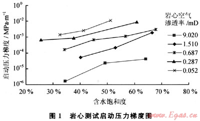 啟動壓力梯度定義為作用在流體上的壓差達到一定程度時,流體克服黏滯力開始流動時的壓力梯度。在低滲透氣藏中,氣體滲流是否存在啟動壓力梯度以及啟動壓力梯度產生的條件一直是石油工作者研究和爭論的焦點之一。持肯定觀點的學者認為天然氣在高溫高壓條件下與孔隙界面會產生一定的界面效應,或因為孔隙中水的存在而致使氣體滲流存在一定的啟動壓力梯度。持否定觀點的研究人員認為天然氣分子小,易于流動,在孔隙介質中流動不存在啟動壓力梯度,如果說因為孔隙中含有一定飽和度的水而致使氣體在某些條件下不流動,應歸于兩相滲流的問題。筆者認為:啟動壓力梯度概念能較好的反映氣體流動的動態特征,綜合反應了儲層物性、含水及驅動壓力對氣體滲流的影響,在滲流方程中引入啟動壓力梯度,能更好地描述低滲儲層的滲流特征,確定氣井的有效動用范圍,為低滲氣藏開發井距的確定和井網優化部署提供依據。根據實驗分析,同一物性巖樣,含水飽和度越大,啟動壓力梯度越大;巖石物性越差,啟動壓力梯度越大,并且受含水飽和度影響更顯著(圖1)。