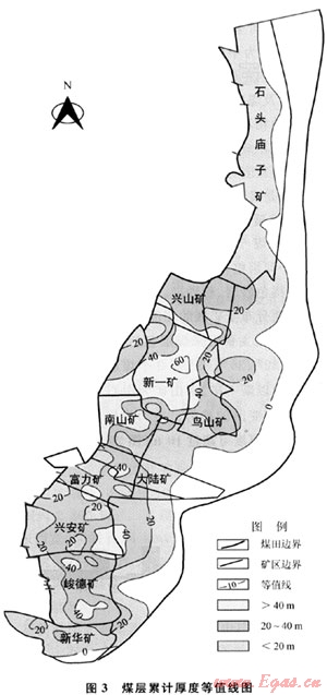 對125口井的煤層累計厚度進行了統計,煤層累計厚度為30~70m。從全區煤層發育情況來看,橫向上煤層連續性較好,但厚度上具有多個聚煤中心,其中大于40m的主要分布在新一、南山礦(分布面積為24.2km2)和興安、峻德礦的局部地區(分布面積為5.5km2);石頭廟子礦區煤層發育較差,厚度一般小于10m(圖3)。在南山、新一礦煤層厚度較大,直接決定了煤層氣生成及吸附能力較其他礦區強,導致瓦斯涌出量相對偏高。