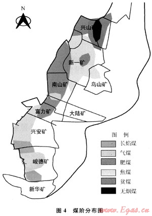例如峻德、興安礦區主要為氣煤和長焰煤,興安北部的富力、大陸、南山礦變為肥煤,至新一礦深部、鳥山區變為焦煤,再向北分布有貧煤和無煙煤(圖4)。因此煤變質程度較高的南山、新一礦煤層瓦斯含量相應增高,使得礦井瓦斯涌出量較大,屬高瓦斯突出礦區。