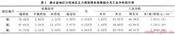紅沙崗地區煤層以光亮、半亮型煤為主,鏡煤、亮煤、暗煤常互層出現[5];煤巖顯微組分以鏡質組為主(表2),一般超過80%,惰性組很少,殼質組含量較高,為3%~8%,對煤層氣的生成有利。