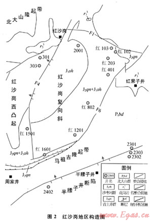 紅沙崗呈北東翹起向南西傾伏的寬緩復式向斜構造[4],軸向北東東(約73°),軸長大于5km;西北翼平緩,傾角10°~20°;東南翼較陡,傾角一般超過25°,北部最陡處可超過55°,次級褶皺、斷裂發育。