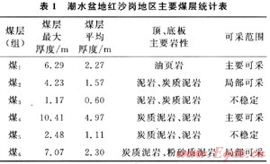 紅沙崗地區共含6個煤層(組)[5~6],總厚度介于3~35m(圖3),煤層自上而下依次編號為煤1~煤6層(組)(表1)。其中煤1和煤4層(組)層位穩定,且分布面積廣,為主要可采煤層,也是煤層氣主要勘探目的層;煤2、煤6層(組)為局部可采煤層;煤3、煤5層(組)極不穩定。煤1、煤2、煤3層(組)位于中巖組下部,煤4、煤5、煤6層(組)位于下巖組上部[7]。