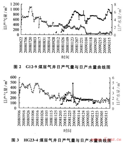 由于壓實作用,該部位裂隙不發(fā)育,其儲層中水的流動類似于地下水流動的“排泄區(qū)”。在排水采氣過程中,接受來自翼部儲層中水的補給,因其處于“排泄區(qū)”,儲層中水匯集于此,排水強度最大,產(chǎn)水量很大,壓降漏斗卻很小[6~8]。因此,向斜部位的煤儲層盡管含氣量相對較高,但連通性較差,煤層氣井穩(wěn)定產(chǎn)氣量一般不高,多在800~1200m3/a,產(chǎn)水量較大。樊莊區(qū)塊內(nèi)HG24-3、HG23-4井等煤層氣井位于向斜核部位置,產(chǎn)氣量低且不穩(wěn)定;HG23-4井產(chǎn)水量相對較大,排采近200d后,產(chǎn)水量約1.7m3/a(圖3)。