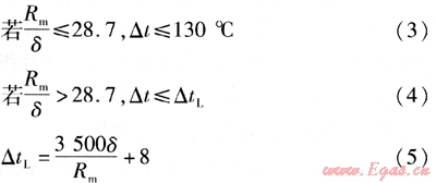 方法2將臨界徑厚比放寬到Rm/δ<40.1,相應壁厚減薄,按方法1核算的極限溫差結果不能滿足最大循環溫差(120℃)要求,但差值不是很大。
