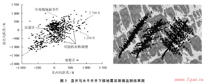 采用上述方法,通過井下微地震波測試,證實頁巖氣直井滑溜水大規模壓裂和水平井分簇射孔分段壓裂形成網絡裂縫,提高了壓裂改造效果(圖3)。