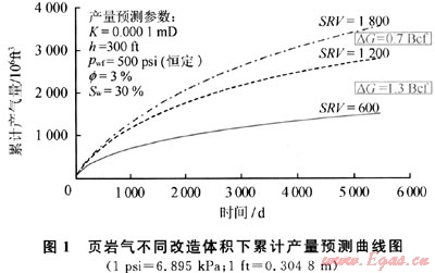 頁巖氣儲層滲透率超低,厚度大,天然裂縫發育,氣體主要以吸附態吸附在有機質表面,常規改造形成單一裂縫很難獲得好的增產效果。數值模擬研究表明[3],頁巖氣儲層改造的體積(SRV,106ft3;1ft3=0.028317m3,下同)越大,壓后增產效果越好(圖1)。但要實現體積改造,除地層要具備體積壓裂的基本條件外,壓裂改造工藝方法也十分關鍵。
