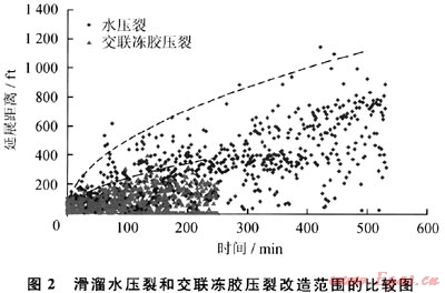3) 敏感性不強,適合大型滑溜水壓裂。弱水敏地層,有利于提高壓裂液用液規模,同時使用滑溜水壓裂,滑溜水黏度低,可以進入天然裂縫中,迫使天然裂縫擴展到更大范圍,大大擴大改造體積。圖2為滑溜水壓裂和交聯凍膠壓裂改造范圍的比較曲線。