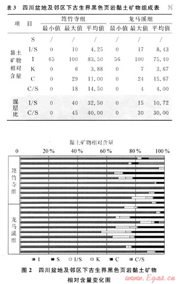 Bowker研究認為,Barnett頁巖層中黏土礦物主要為微含蒙皂石的伊利石[10]。四川盆地及鄰區筇竹寺組和龍馬溪組頁巖儲層黏土礦物分析結果也表明其組成主要是伊利石,其次為綠泥石,不含蒙皂石,有少量的高嶺石和伊/蒙混層(表3、圖2)。筇竹寺組的伊利石含量較龍馬溪組高,平均值為83.5%,I/S混層比在0~40%,平均為32.5%;龍馬溪組的綠泥石平均含量為15.67%,I/S混層比平均為10.72%。