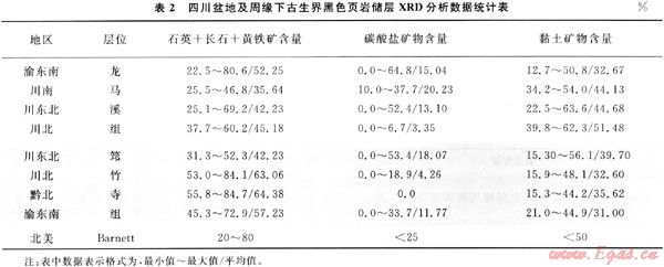 北美地區Barnett頁巖的石英、長石和黃鐵礦含量為20%~80%(其中石英含量為40%~60%),碳酸鹽礦物含量低于25%,黏土礦物含量通常小于50%。四川盆地下古生界2套頁巖的X射線熒光衍射(XRD)分析結果總體與Barnett頁巖相似(圖1、表2),其石英、長石和黃鐵礦的平均含量為30%~64%,碳酸鹽礦物的平均含量低于20%,極少數為0,黏土礦物含量平均在31%~51%。與Barnett頁巖對比,龍馬溪組的硅質含量偏少,筇竹寺組的含量偏多,但龍馬溪組的碳酸鹽礦物含量較高,而筇竹寺組的含量偏少。研究表明,石英等脆性礦物含量高有利于后期的壓裂改造形成裂縫;碳酸鹽礦物中方解石含量高的層段,易于溶蝕產生溶孔。