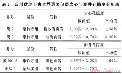 四川盆地頁巖儲層物性分析取得部分孔隙度資料,因滲透率測試靈敏度低未測出。資2井筇竹寺組黑色粉砂質頁巖樣品物性分析孔隙度分布在1.0%~2.5%,平均孔隙度為1.58%;資3井硅質頁巖的孔隙度為0.12%~0.70%。威001-2井筇竹寺組頁巖儲層的測井孔隙度在0.69%~3.08%,平均值為1.64%,滲透率在0.001~0.11mD,平均值為0.019mD[12~15]。陽深2井龍馬溪組測井解釋孔隙度一般為1.0%~5.0%(表5)。陽63、隆32等井在龍馬溪組已測試獲氣流,可見,四川盆地下古生界頁巖具備儲集條件。