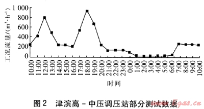 這就需要我們根據不同季節、不同時段管網負荷的峰谷情況,調整供氣工況。例如對河東區域供氣的衛國道高-中壓調壓站、津濱高-中壓調壓站、張貴莊高-中壓調壓站,我們通過適當調低衛國道高-中壓調壓站、津濱高-中壓調壓站調壓器出口壓力、關閉壓力,即衛國道高-中壓調壓站、津濱高-中壓調壓站調壓器出口壓力為0.095MPa,關閉壓力為0.12MPa,張貴莊高-中壓調壓站調壓器出口壓力為0.11MPa,關閉壓力為0.14MPa。通過調整調壓器參數來實現高-中壓調壓站間大小流量自動切換,即用氣低峰時僅張貴莊高-中壓調壓站給河東區域供氣,用氣高峰時,衛國道高-中壓調壓站、津濱高中壓調壓站、張貴莊高-中壓調壓站同時供氣,這樣可以有效避免高-中壓調壓站流量計每天小流量數據丟失問題。對給河北區供氣的金鐘高-中壓調壓站,我們采用一臺大調壓器及一臺小調壓器并聯運行,適當調低大調壓器出口壓力、關閉壓力,即大調壓器出口壓力為0.095MPa,關閉壓力為0.12MPa,小調壓器出口壓力為0.12MPa,關閉壓力0.15MPa,這樣用氣低峰時僅小調壓器供氣,用氣高峰時,大、小兩組調壓器同時供氣,這樣提高計量精度,并且避免由于僅大調壓器供氣造成調壓器頻繁開啟關閉產生氣體脈動流導致的計量誤差。