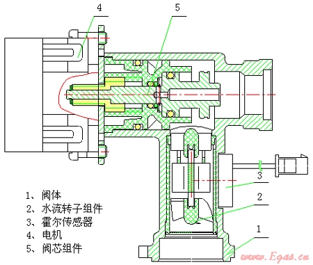 水量伺服閥主要由水流轉子組件、霍爾傳感器、閥芯組件、電機等組成。當水流經過渦輪殼時,推動磁性轉子旋轉,不同磁極靠近霍元件時導通,離開時斷開,從而產生高低脈沖電平輸出給電腦控制器,再由控制器判斷計算出水流量的大小。當燃氣具設定不同的溫度時,控制器首先調節燃氣控制比例閥的出氣量同時通知電機拖動閥體組件調節出水口的水量大小。這樣,控制器可通過水溫反饋信號自動進行細微的無級調節,從而達到快速調節水溫、穩定水溫目的。