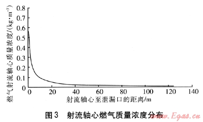 編程計算的燃氣射流軸心質量濃度分布見圖3。當射流軸心至泄漏口的距離約為9.9m時,含量達到爆炸上限(15%),當射流軸心至泄漏口的距離約為30.6m時,含量低于爆炸下限(5%)。當射流軸心至泄漏口的距離為154m時,含量低于燃氣的警戒體積分數(1%)。
