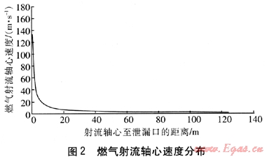 編程繪制的燃氣射流軸心速度分布見圖2。由圖2可知,燃氣射流軸心速度迅速衰減,當距離泄漏口約125m時,射流軸心速度降至1m/s(靜止空氣中),可視為射流結束。