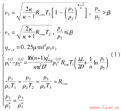 假設燃氣從點1流至點2為管內多變流動過程,從點2泄漏到點3為等熵流動過程,推導得到點3處燃氣的溫度、壓力、流速、密度和質量流量[2],見式(1)。