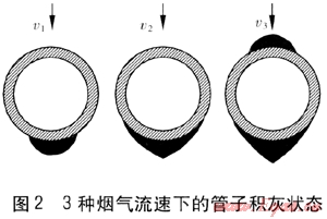 煙氣中攜帶的飛灰及催化劑粒徑一般都小于200μm,大部分是10~20μm的顆粒。當含灰的氣流沖刷管束時,產生旋渦區,大顆粒由于慣性大,不易進入旋渦,進入旋渦區的大部分為微小顆粒。在分子力吸附作用和靜電力的作用下,遇到低溫受熱面管壁便聚積下來。松灰呈干松狀,易吹除,但其熱阻很大,對傳熱有很大影響[3]。積灰主要在管子背風面形成,當煙氣流速較大時,迎風面基本沒有積灰,因此積灰程度與煙氣流速有關。3種煙氣流速下管子的積灰狀態見圖2。圖中,v1>v2>v3。對于最高的煙氣流速v1,管子積灰最少,v2積灰較多,v3積灰最嚴重。因此,煙氣流速越大,在管子的背風面越不易積灰。