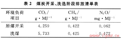 根據(jù)本文參考文獻(xiàn)[4]的統(tǒng)計(jì),煤炭在開采、洗選(包括坑口附近的短距離運(yùn)輸)階段的排放清單如表2。