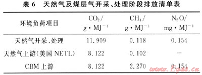 煤層氣(CBM)現(xiàn)階段總體利用率不高,分為地面抽采和井下抽采兩種。這里主要考慮具有大規(guī)模開發(fā)價(jià)值的地面抽采,典型的CBM中CH4含量普遍在95%左右,取地面抽采利用率為70%。由于普遍缺乏CBM開采與處理過程中的排放資料,這里參照天然氣的開采階段清單,但甲烷排放量有所提高。參見表6。