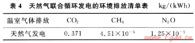 SNG發(fā)電同常規(guī)的天然氣發(fā)電。由于所占比例甚小,在忽略電廠建設(shè)用材、電廠建設(shè)及退役產(chǎn)生的氣體排放后,參照本文參考文獻(xiàn)[5,9]可得出天然氣聯(lián)合循環(huán)發(fā)電的環(huán)境排放清單,見表4。