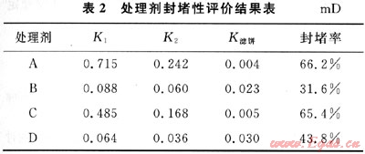 實驗中采用代號為A、B、C、D的4種處理劑,在3.5MPa循環壓力下對取自井下同一深度的巖心進行了封堵效果測試,結果見表2。