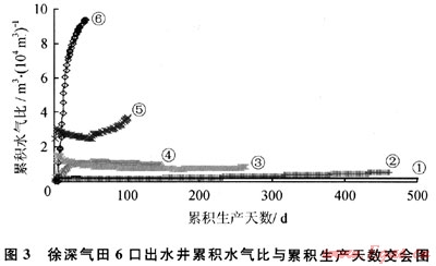 在定性劃分徐深氣田氣井出水類型基礎上,再通過日產水量與日水氣比界限法、累積產水量與累積產氣量交會法、累積水氣比與累積生產天數交會法定量劃分氣井出水類型。