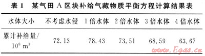 根據圖3采用常規物質平衡法計算得到A區塊的動態控制儲量為475.88×108m3,其動態控制儲量遠遠大于A區地質儲量,出現“超百”現象,不符合常理。分析認為:該區塊與B區塊間存在相互補給和外溢漏失的情況,B區塊和A區塊相鄰并由一條斷層分隔,B區塊后期加鉆1口井測壓顯示地層壓力已降至27MPa,說明該區塊已被動用(即產生了外溢)。應用上述建立的補給氣藏物質平衡方程可以計算收益區塊A區塊補給量的大小,其計算結果見表1。