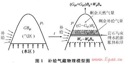 1936年,Schilthus首先推導出體積物質平衡方程,此方法可以簡單有效的估算地層內原始氣體和氣藏枯竭各階段天然氣儲量,是油氣藏動態分析的一種標準的油氣藏丁程工具。筆者借鑒物質平衡原理[2,13~15],將氣藏模擬為單獨儲罐體,并考慮有外來天然氣及水體通過薄的可滲透邊界不斷流入氣藏的情況下建立新的補給氣藏物理模型(圖1)。