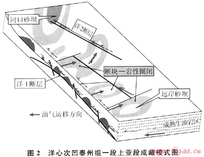 油氣成藏研究表明,白駒凹陷洋心次凹洋1、洋2、洋3等北西-南東向的斷層是在泰州組,阜寧組沉積完以后發育,三垛運動定型,其對泰一段上亞段的砂體沉積不起控制作用。但洋1斷層貫穿緩坡帶上的多個小砂壩,并與成熟生油區相連接,它將成熟生油區生成的石油,通過與其形成輸導網絡的次級斷層和砂體運移到各個有利圈閉中,形成油藏,是開陽等油藏的主要油源的運移通道。現有的白駒油區已發現的油藏均屬此類。