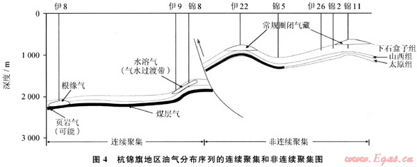 受烴源巖分布范圍、生烴史、儲層砂體展布規律、圈閉發育情況、斷裂活動期次及儲層最終致密化時間的影響,該區主要發育兩種不同的聚集類型,連續聚集(煤層氣或頁巖氣、根緣氣、水溶氣)和非連續聚集(常規圈閉氣藏),主體上分別分布在南部和北部地區。